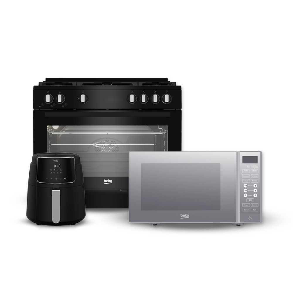 Beko Freestanding Gas Cooker 5 Burners with Digital Air Fryer 3.9 Liters Black and Microwave 23 Liters Silver
