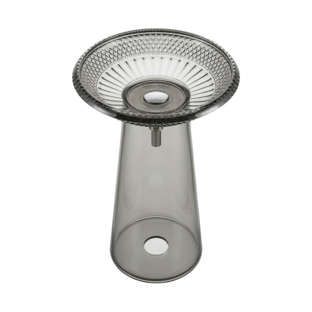 حوض دروب القائم باللون الرمادى تصميم فاخر يجمع بين الجرأة والأناقة. مصنوع من زجاج كريستالي بلمعة عميقة تعكس الإضاءة بشكل مبهر، ليكون قطعة مركزية مميزة في أي حمام عصري أو فاخر.